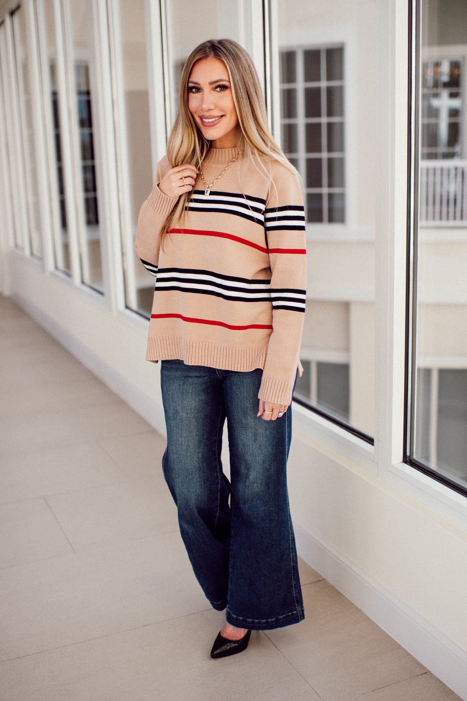 This effortlessly chic sweater features a soft neutral base, accented with bold stripes in black, white, and a pop of red for a timeless yet modern look. Designed with a relaxed fit and cozy knit feel, it drapes beautifully for easy, everyday wear. The longer length offers flattering coverage, making it perfect to pair with jeans, leggings, or layered over a tank. A go-to piece for casual days when you still want to look put together.