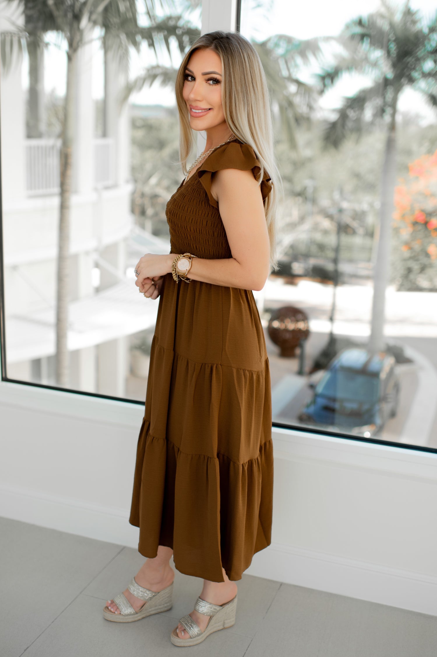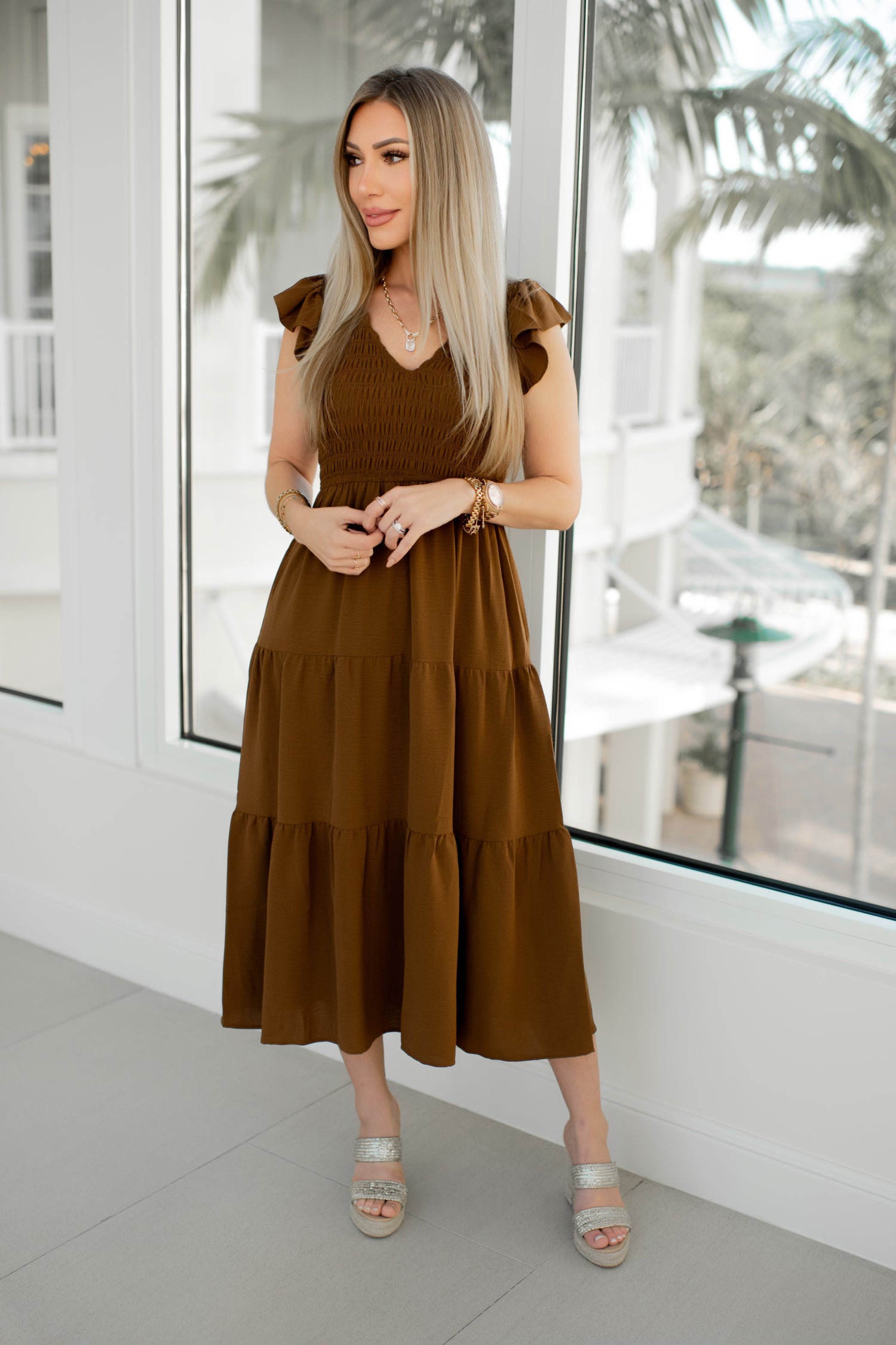 A lightweight, flowy midi dress designed with a stretchy smocked bodice that comfortably fits both smaller and fuller busts. Featuring a flattering v-neckline, feminine flutter sleeves, and a tiered skirt with partial lining for confident coverage. Perfect for weddings, showers, graduations, and warm-weather events.