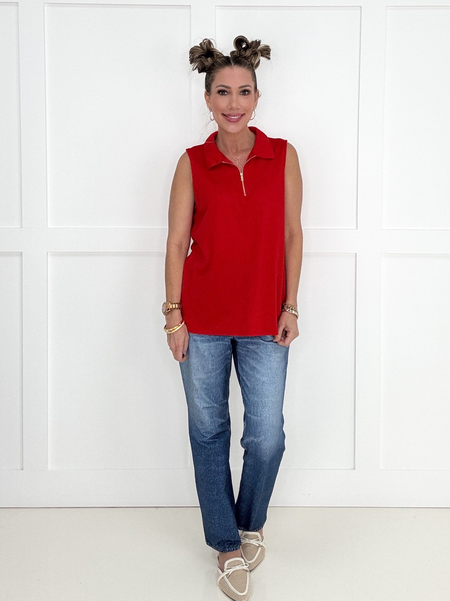 This sleeveless zip front top blends polished style with an athletic-inspired feel. Made from a smooth, lightweight performance fabric, it has just the right amount of stretch for all day comfort. The structured collar and half zip neckline give it a sporty chic vibe, while the relaxed fit keeps it flattering and easy to wear. Perfect for running errands, travel days, or dressing up with denim or trousers for a casual cool look.