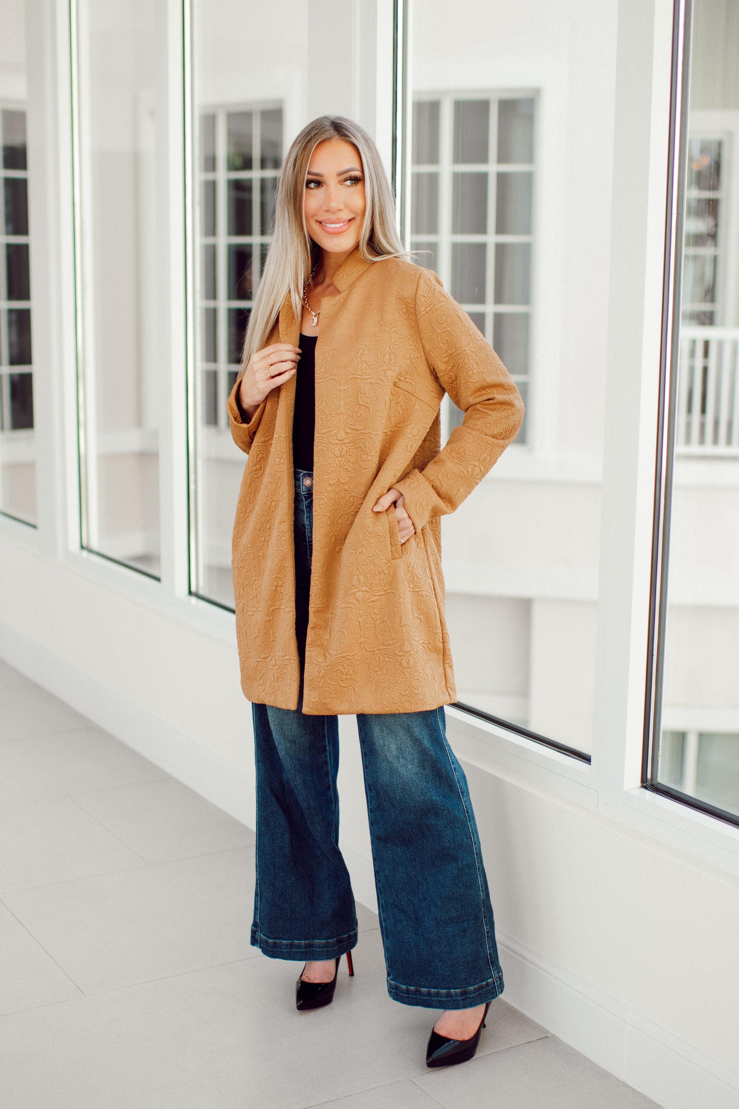Elevate your everyday style with this jacquard midi coat that comes in seven fabulous colors. The textured pattern instantly upgrades whatever you wear whether you’re tossing it over jeans and a tee or pairing it with dressier pieces. With its flattering tailored midi length and elegant structure, it’s the kind of piece that makes you look effortlessly put together every time you step out.