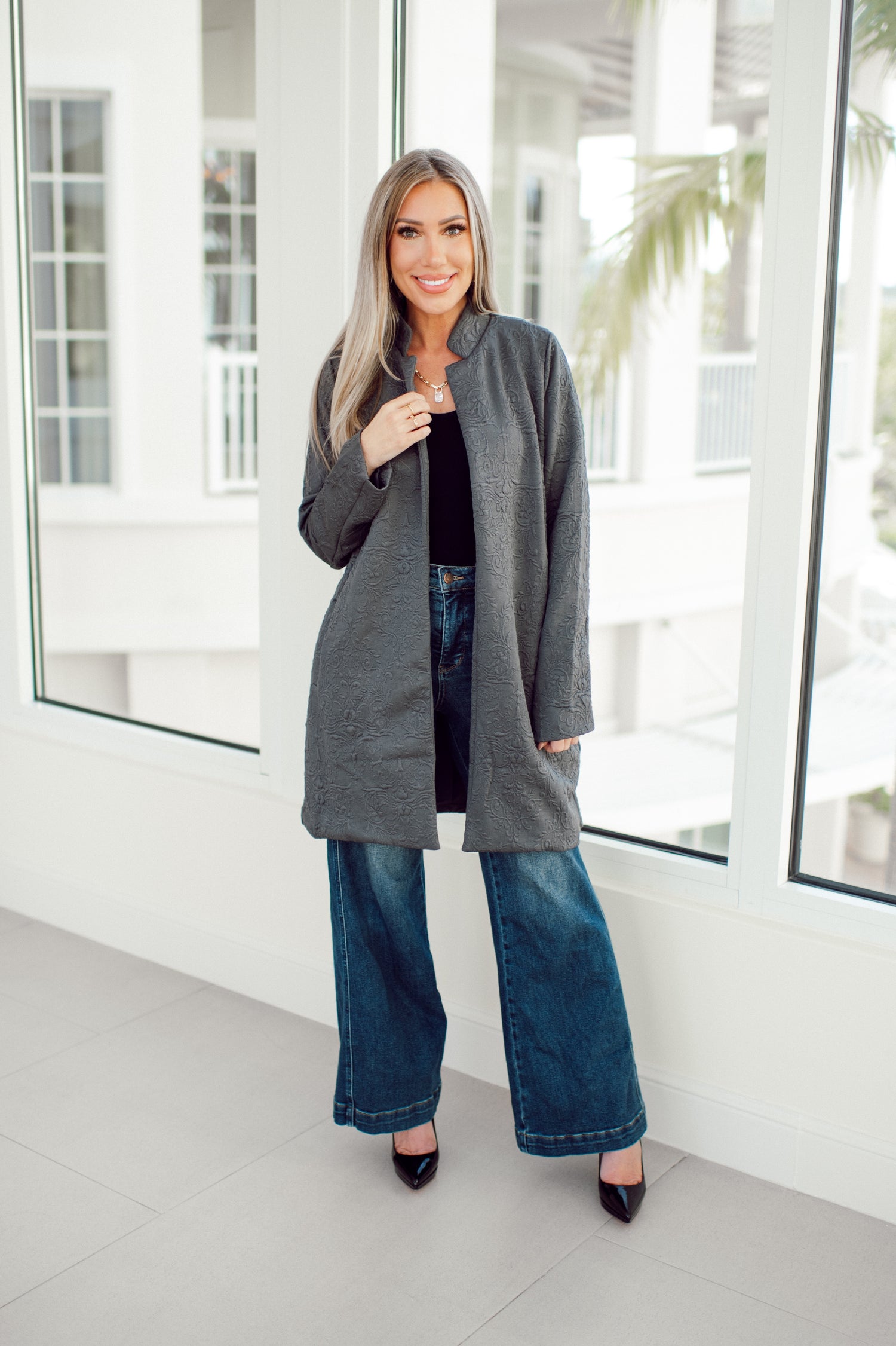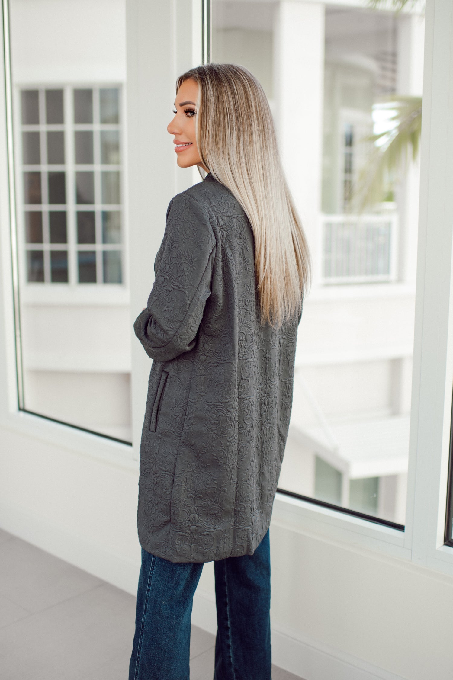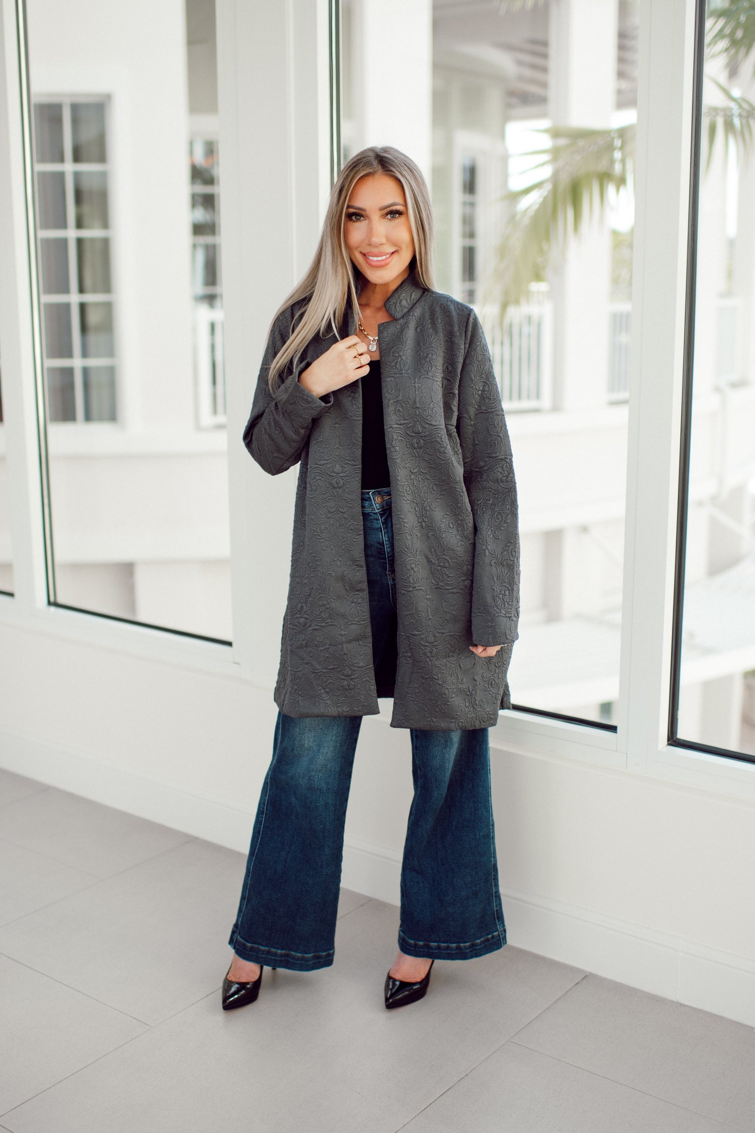 Elevate your everyday style with this jacquard midi coat that comes in seven fabulous colors. The textured pattern instantly upgrades whatever you wear whether you’re tossing it over jeans and a tee or pairing it with dressier pieces. With its flattering tailored midi length and elegant structure, it’s the kind of piece that makes you look effortlessly put together every time you step out.