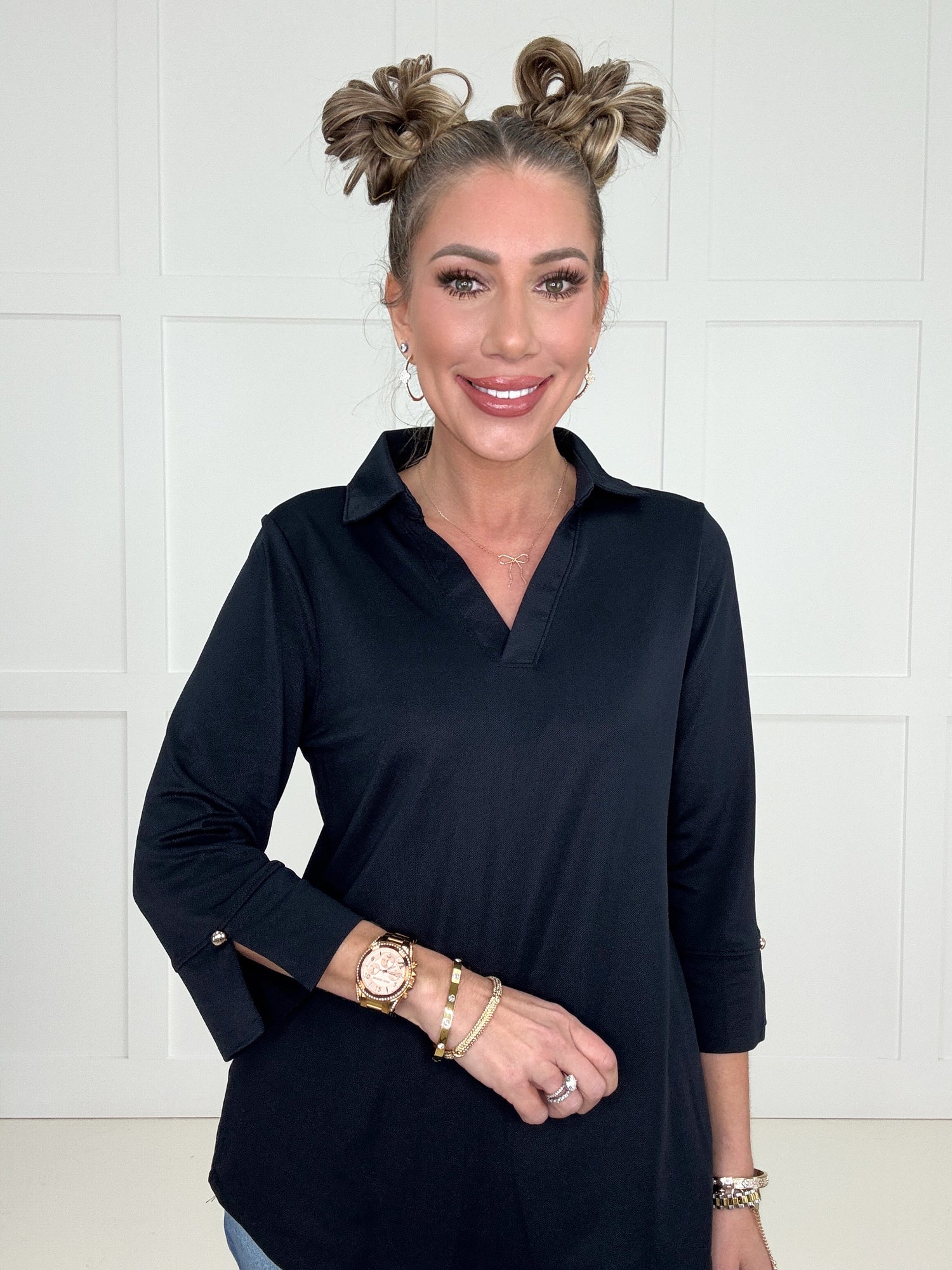 This top is the definition of effortless polish. Designed in a soft, stretchy fabric that drapes beautifully without clinging, it features a flattering collared neckline and relaxed fit that works for every day or dressed-up moments. The 3/4 sleeves with button detail add an elevated touch while keeping it comfortable and easy to wear.