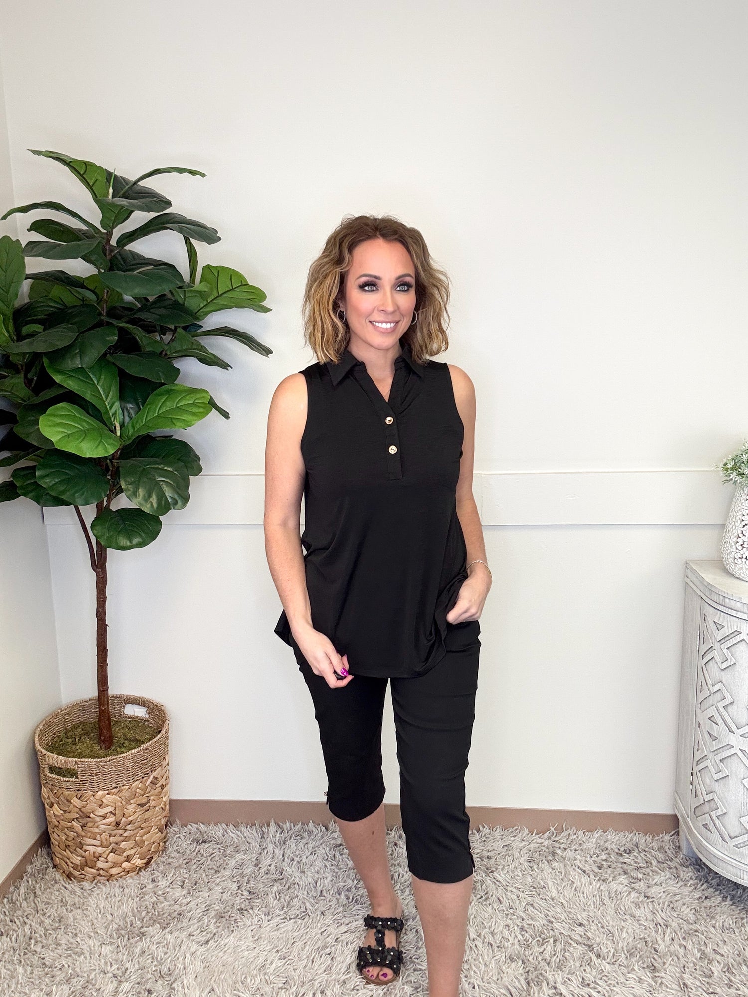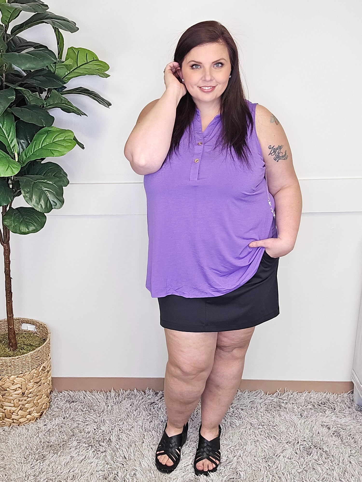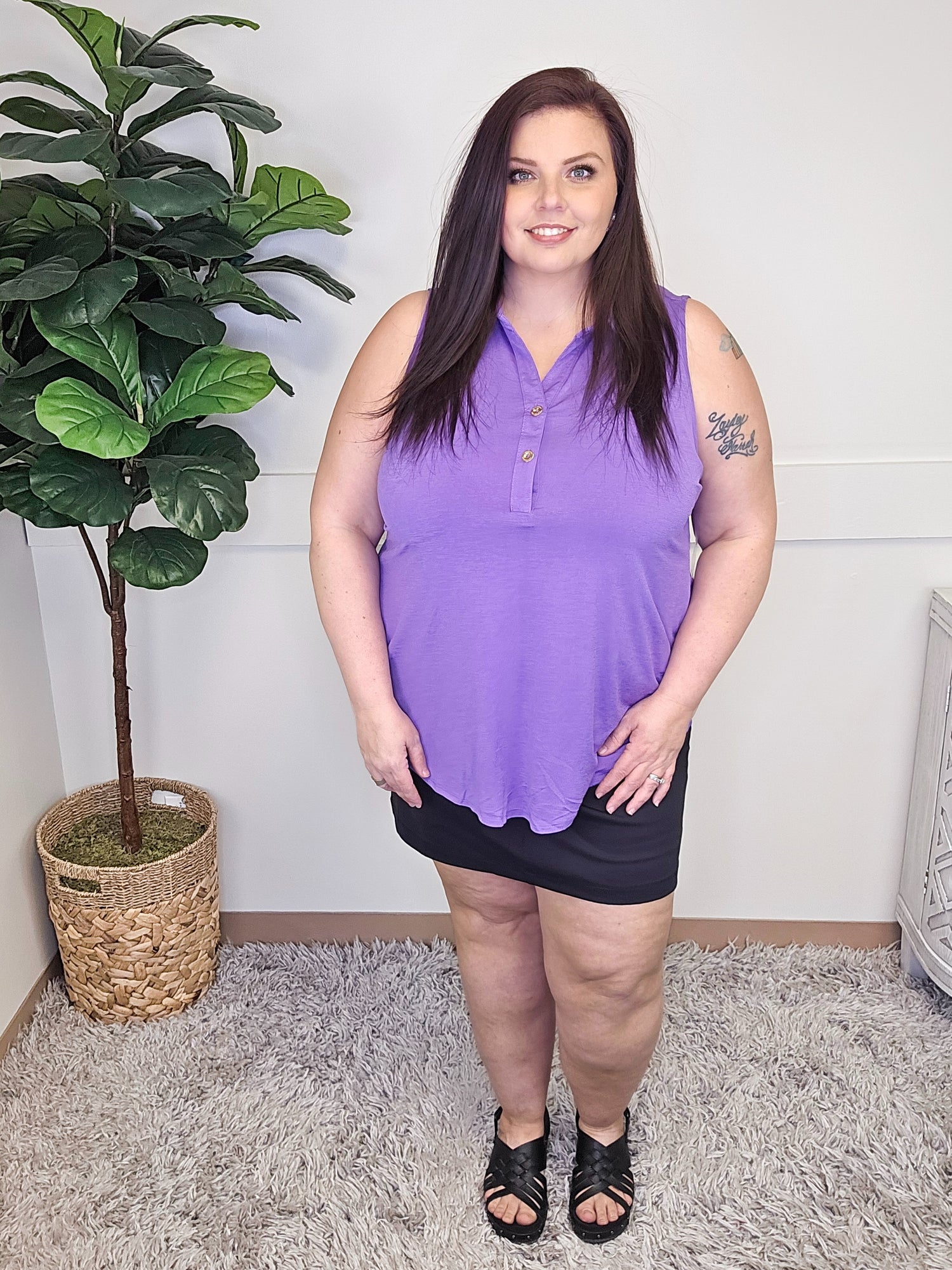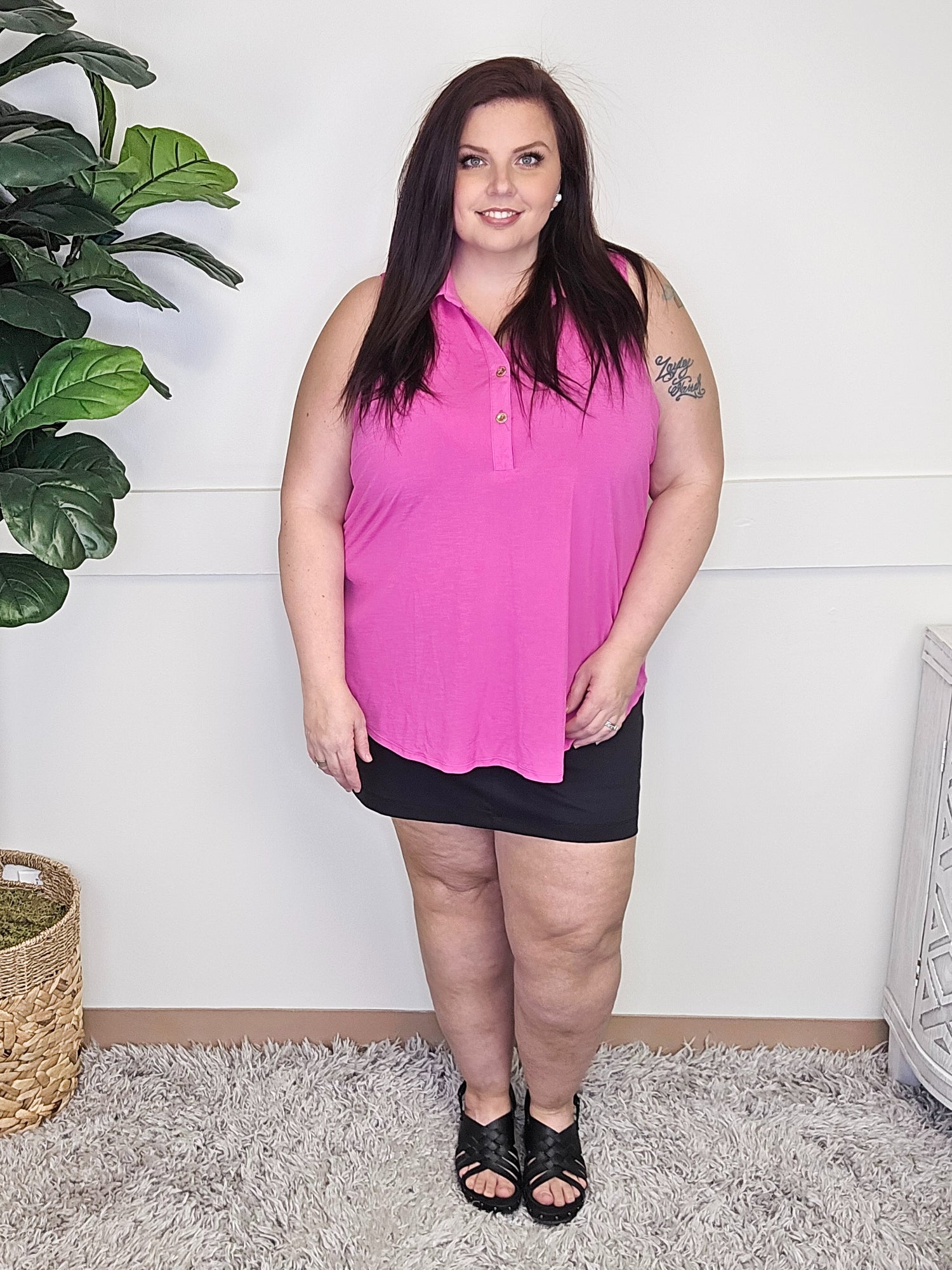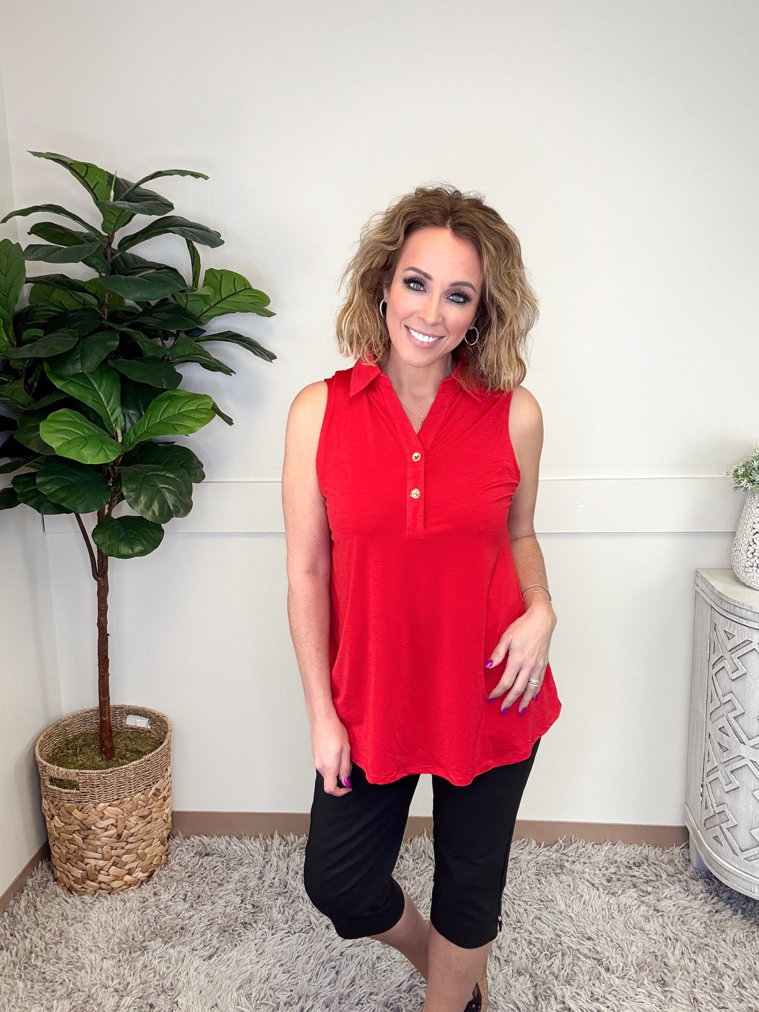 Dear Scarlett is one of the hottest brands around known for their fun prints and bright solids. This collared button tank will give you that polished look every time. The fabric is super stretchy and flows nicely. Appropriate for work and a fun night out on the town. This tank runs true to size, but roomy.
