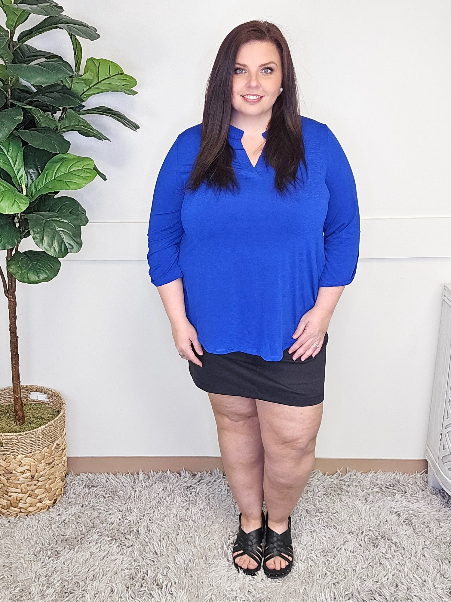 Dear Scarlett is one of the hottest brands around known for their fun prints and bright solids. The fabric is super stretchy and flows nicely. Appropriate for work and a fun night out on the town. Their clothing runs true to size, but roomy.