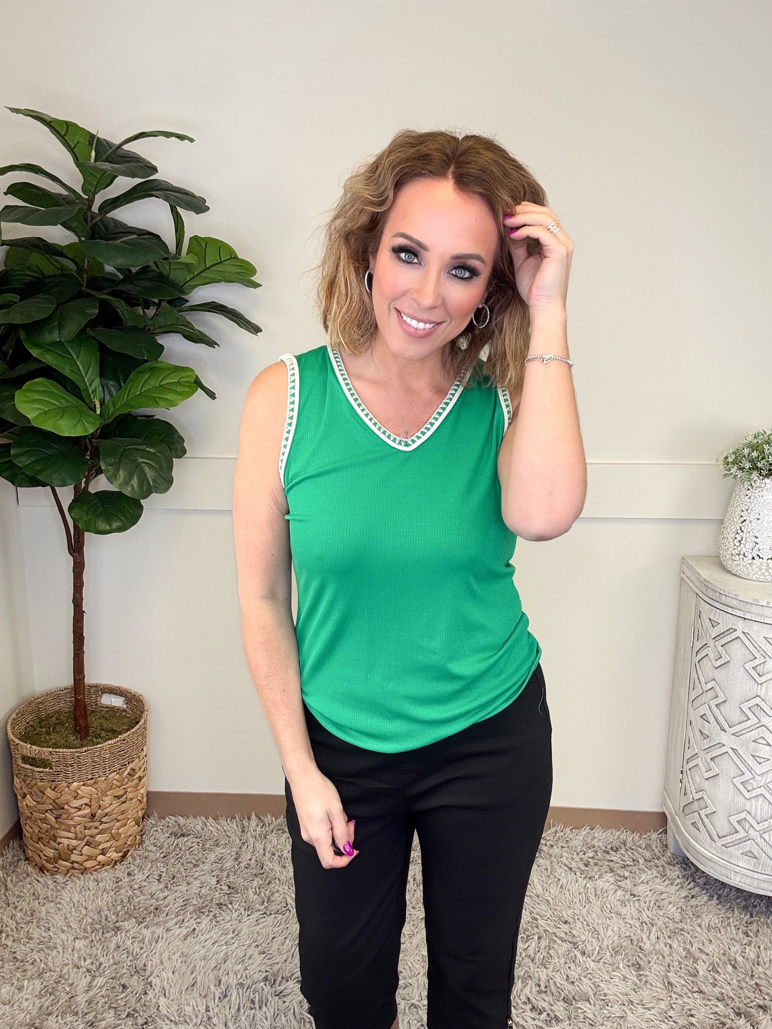 This vibrant tank is the perfect blend of sporty and chic. Designed with a flattering V-neckline trimmed in crisp contrast detailing, it elevates a simple silhouette with a fresh, polished touch. The soft, lightweight ribbed fabric offers comfortable stretch and a smooth, easy fit that skims the body without clinging. Sleeveless and breathable, it’s ideal for layering or wearing solo on warm days. Dress it up with trousers or keep it casual with denim. This tank is a versatile must-have for everyday wear.