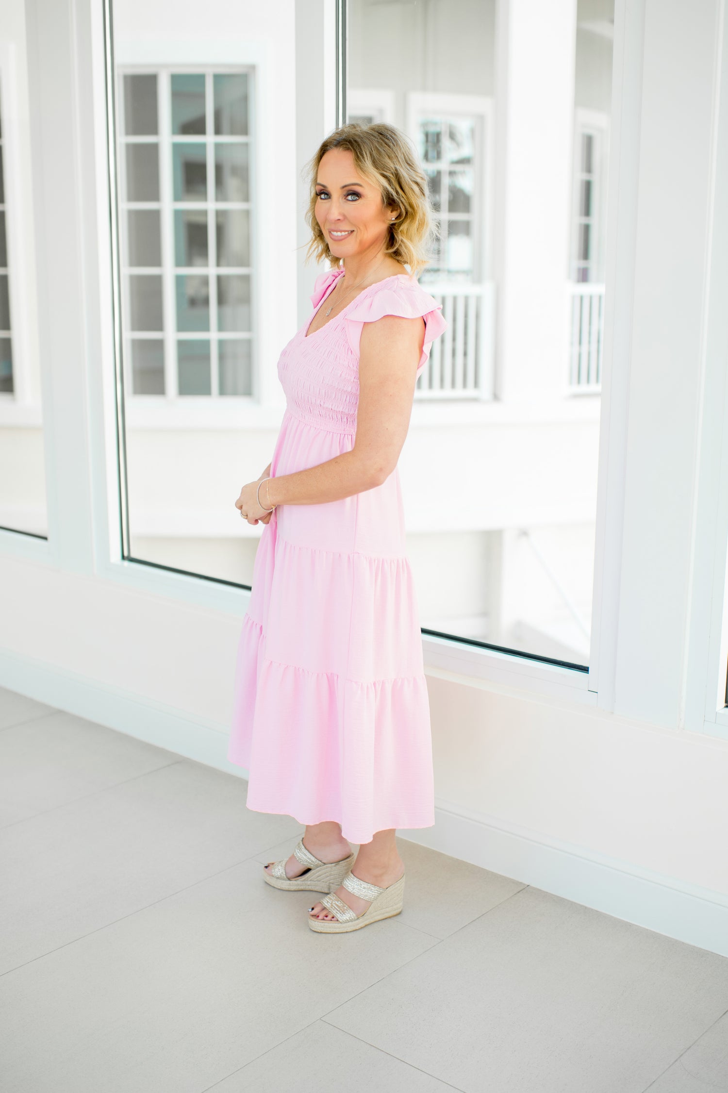 A lightweight, flowy midi dress designed with a stretchy smocked bodice that comfortably fits both smaller and fuller busts. Featuring a flattering v-neckline, feminine flutter sleeves, and a tiered skirt with partial lining for confident coverage. Perfect for weddings, showers, graduations, and warm-weather events.