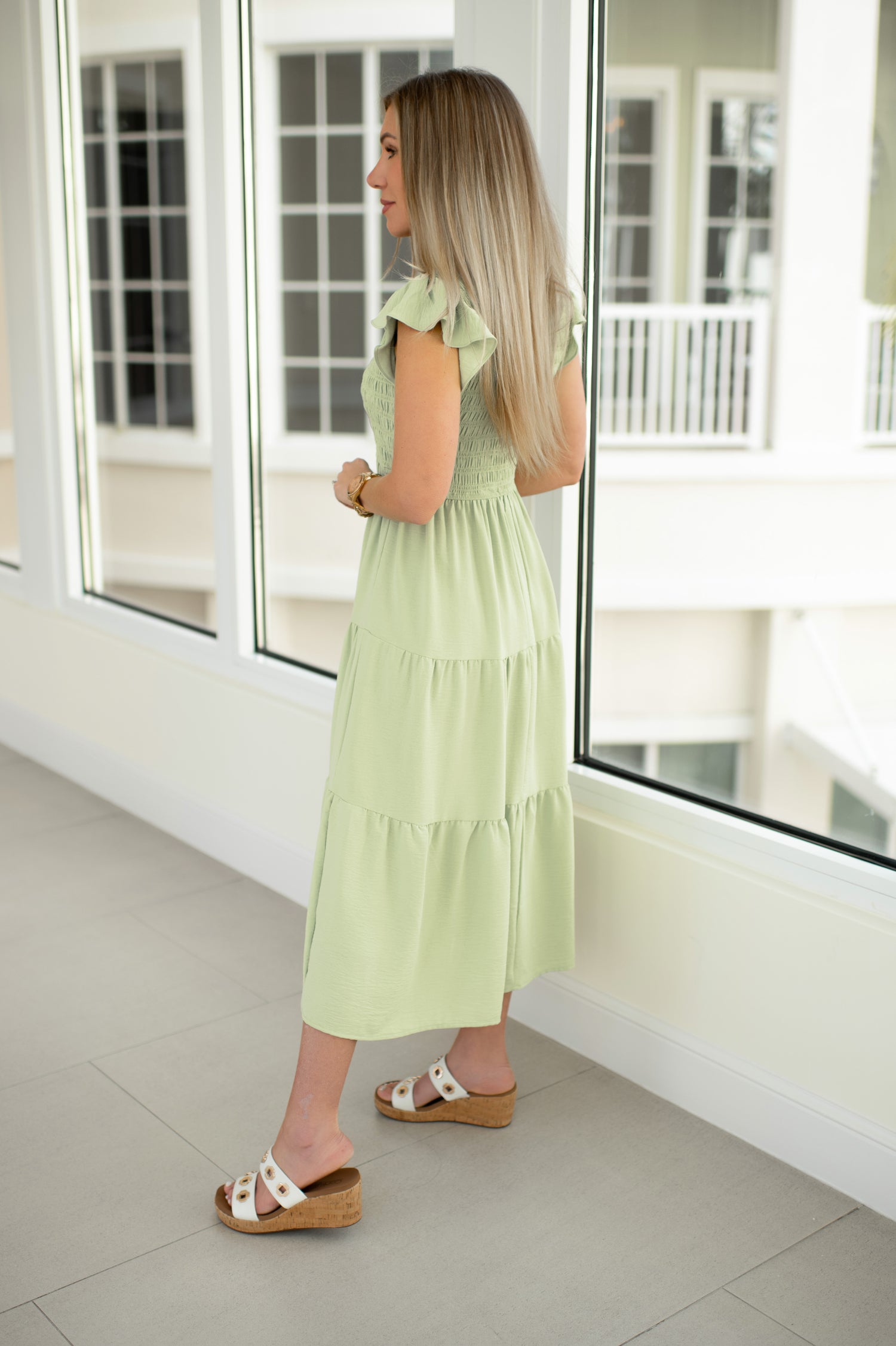Spring Green Flutter Sleeve Midi Dress