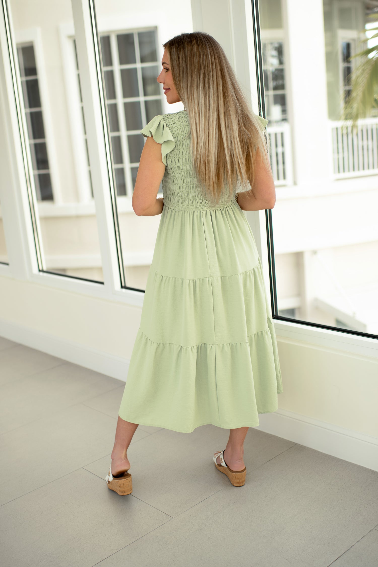 A lightweight, flowy midi dress designed with a stretchy smocked bodice that comfortably fits both smaller and fuller busts. Featuring a flattering v-neckline, feminine flutter sleeves, and a tiered skirt with partial lining for confident coverage. Perfect for weddings, showers, graduations, and warm-weather events.