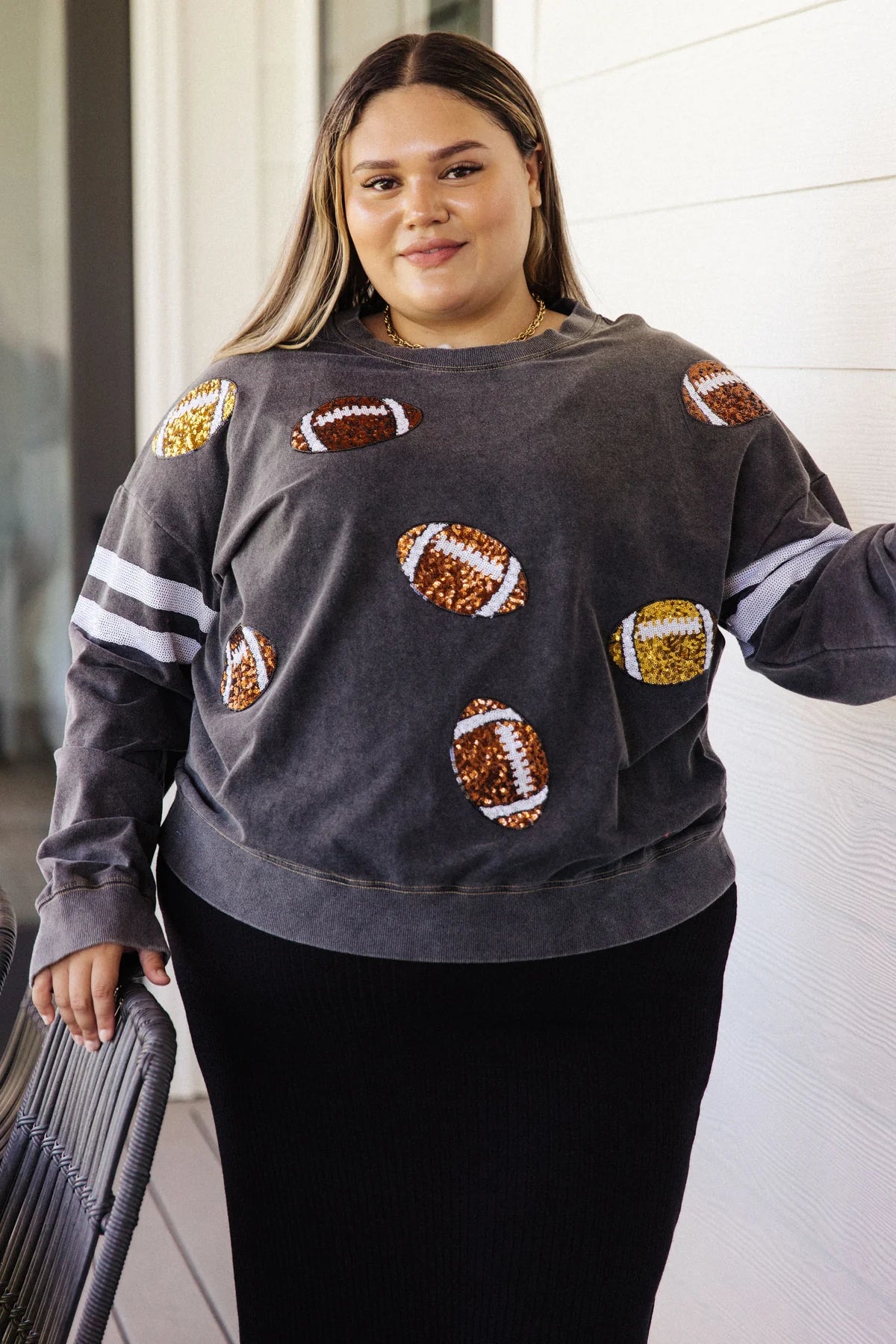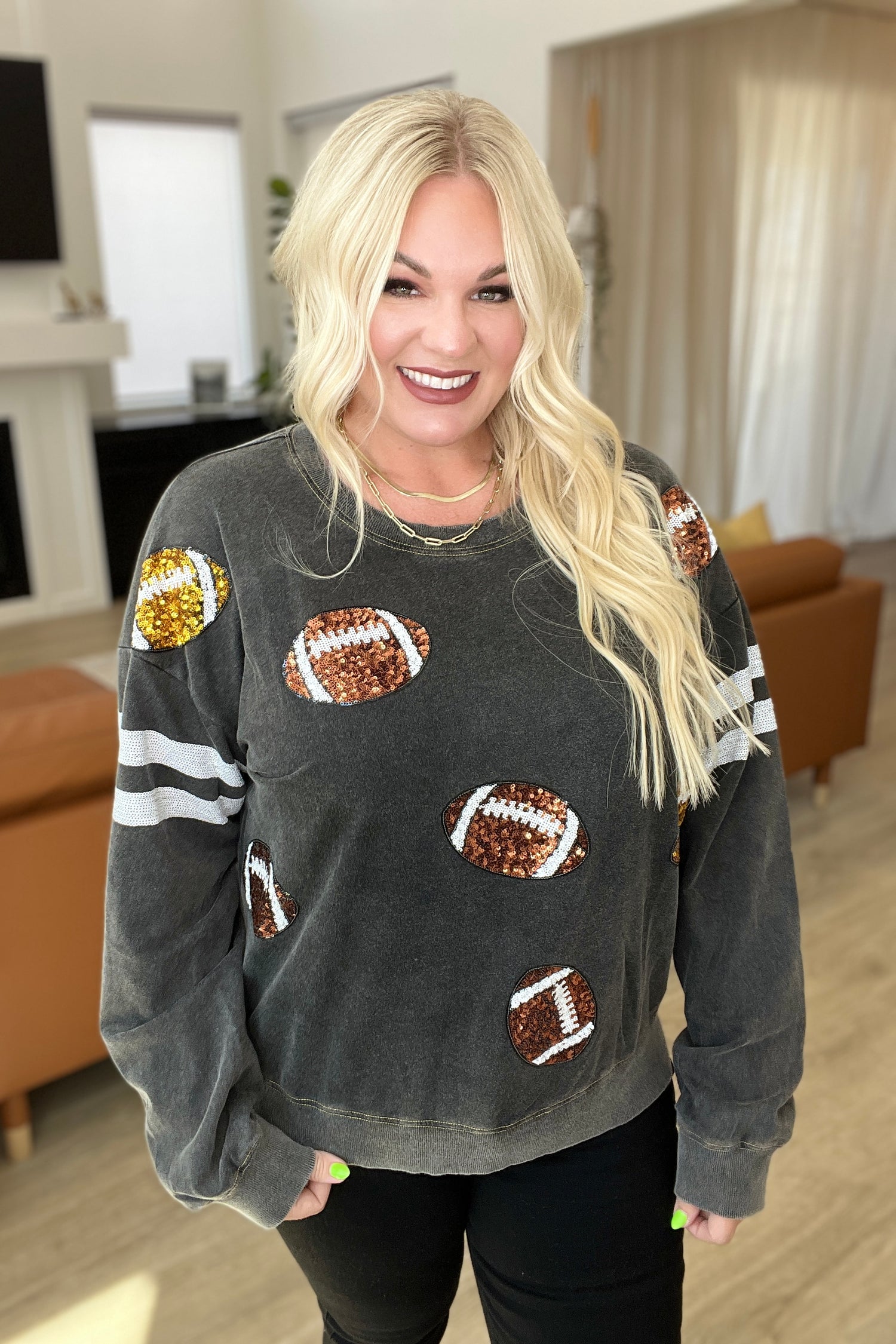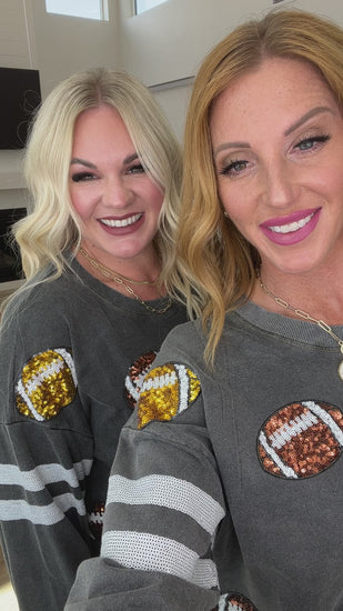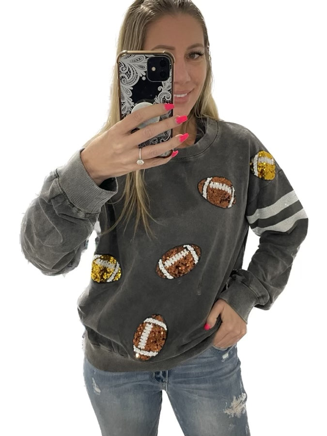 Score a touchdown in fashion with this eye-catching Tailgates & Touchdowns Sweatshirt. Featuring a hail Mary pass of sequin footballs on the front and striped sequin sleeves, this mineral wash sweatshirt is a total win that's super comfy. Throw this on and get in the game! Go true to size