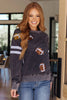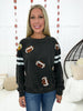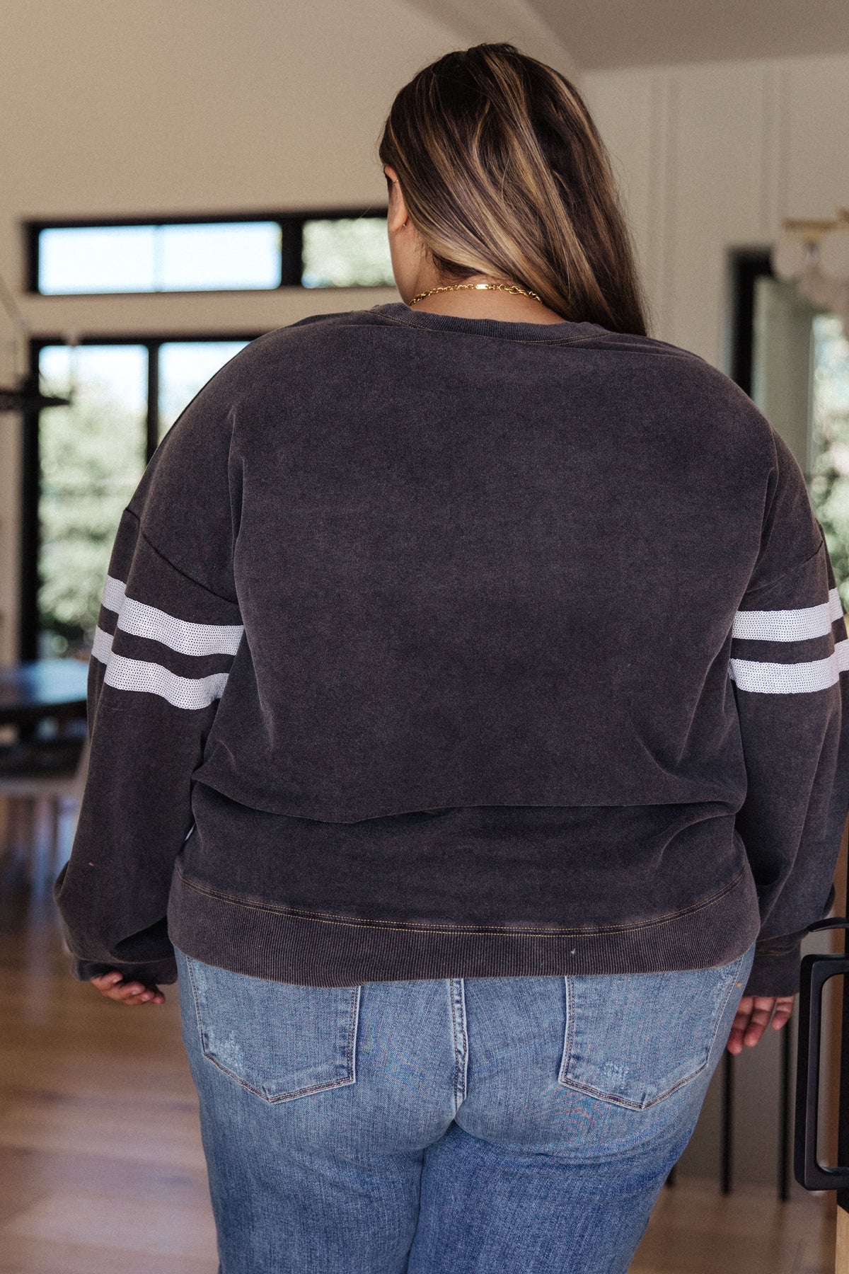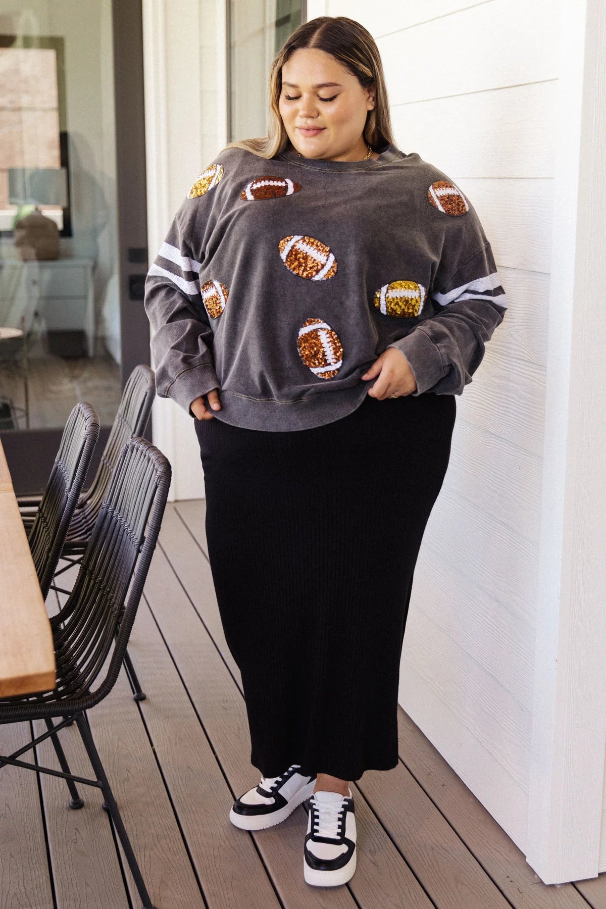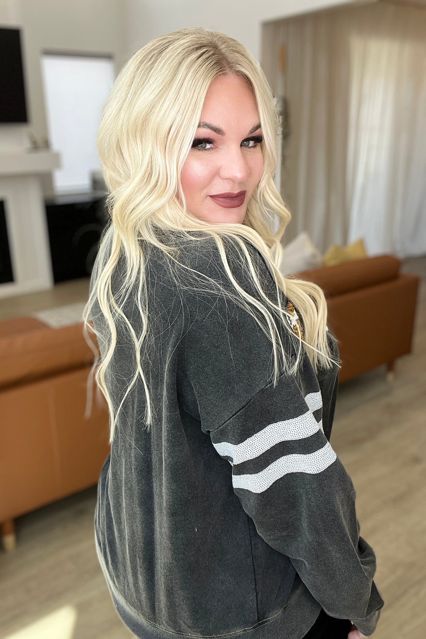 Score a touchdown in fashion with this eye-catching Tailgates & Touchdowns Sweatshirt. Featuring a hail Mary pass of sequin footballs on the front and striped sequin sleeves, this mineral wash sweatshirt is a total win that's super comfy. Throw this on and get in the game! Go true to size
